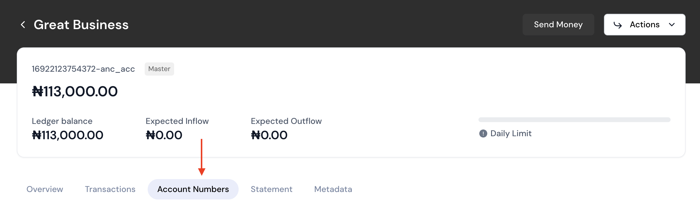 - Click on the “Account Numbers” tab. You’ll see: Account number, Bank name, Other banking details needed to transfer funds